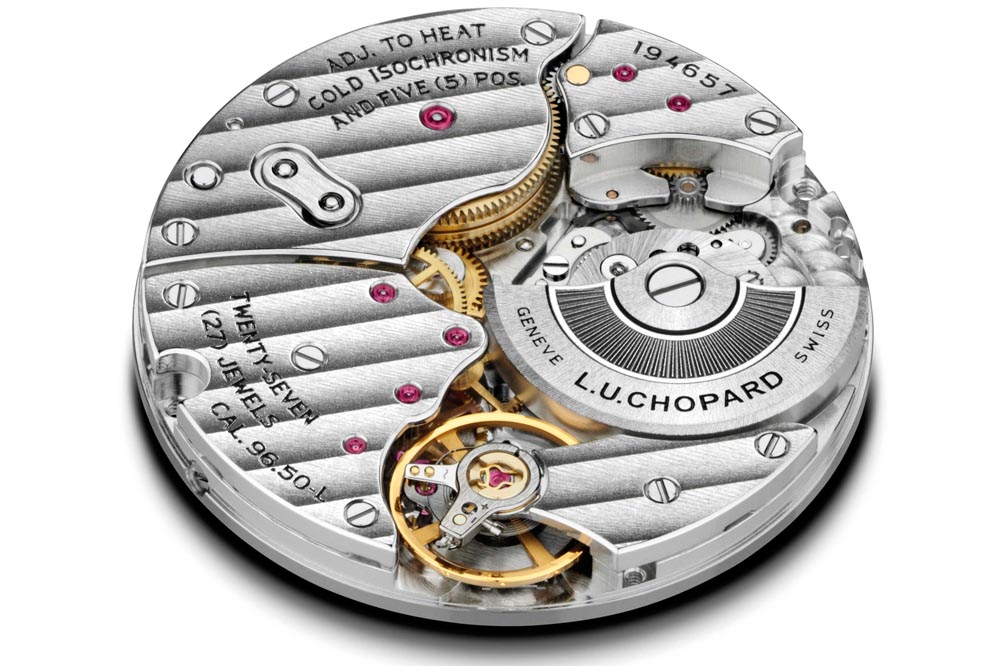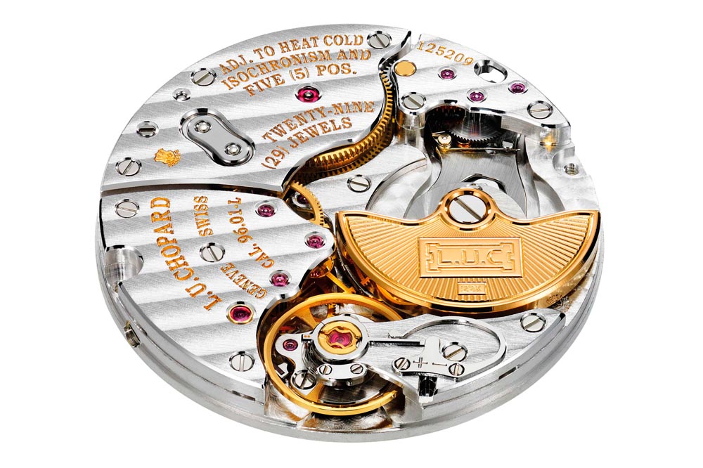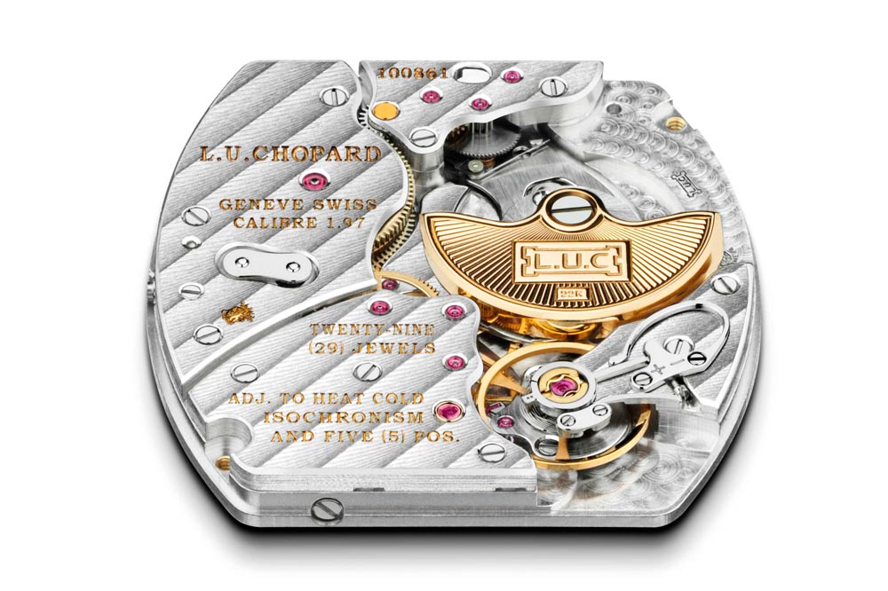 Sin embargo, en este caso la distinción en esta ocasión está personificada en su calibre, dotado de micro rotor y que responde al nombre de L.U.C 97-01L, realizado también con la misma forma de la caja tonneau, una rareza mecánica en los tiempos actuales, y además con un mínimo grosor de 3,3 mm de altura. Un trabajo coronado con una autonomía de marcha de 65 horas, sustentada en el sistema de dos barriletes superpuestos, el conocido y patentado Twin®, toda una garantía de fiabilidad para lograr una excelente cronometría durante toda la reserva de marcha.